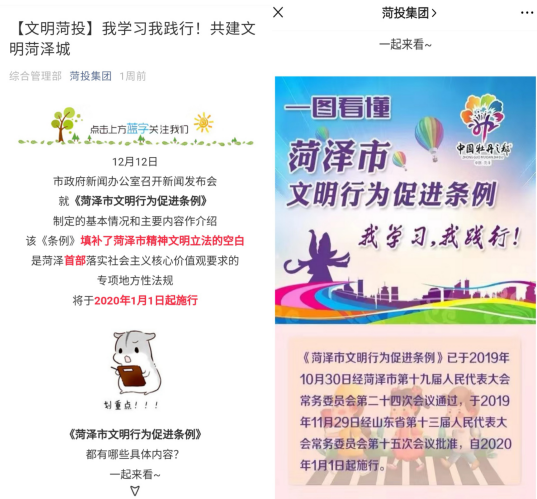 3月5日是全國第57個“學雷鋒紀念日”,菏投集團組織8名志愿者利用下午上班前的時間,分成2個小組在公司辦公區(qū)域向各寫字樓辦公人員和來訪人員發(fā)放《學習雷鋒精神和志愿服務精神倡議書》《雷鋒同志的先進事跡》,面對面耐心細致地向群眾宣傳雷鋒精神,講解雷鋒先進事跡,發(fā)動群眾爭做雷鋒精神的倡導者、踐行者、推動者。同時以本次活動為契機,廣泛宣傳《菏澤市文明行為促進條例》,弘揚社會主義核心價值觀。3月9日,公司又廣泛動員廣大干部員工認真學習《菏澤市文明行為促進條例》,并在公司公眾號以圖文形式進行轉載,積極引導員工樹立文明意識,提升文明素質。