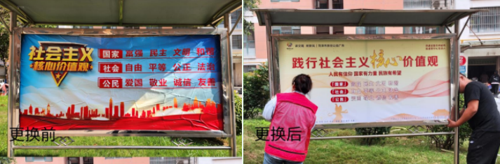 經(jīng)過前期開展的老舊、破損公益廣告全面排查,針對小區(qū)主次干道、廣場、宣傳欄等長期裸露在外、因風吹日曬等原因造成褪色、破損、殘缺的公益廣告進行“全覆蓋”提檔升級。此次提綱升級公益廣告牌共計18塊,并對墻面、電線桿上野廣告、“牛皮癬”進行了清除。