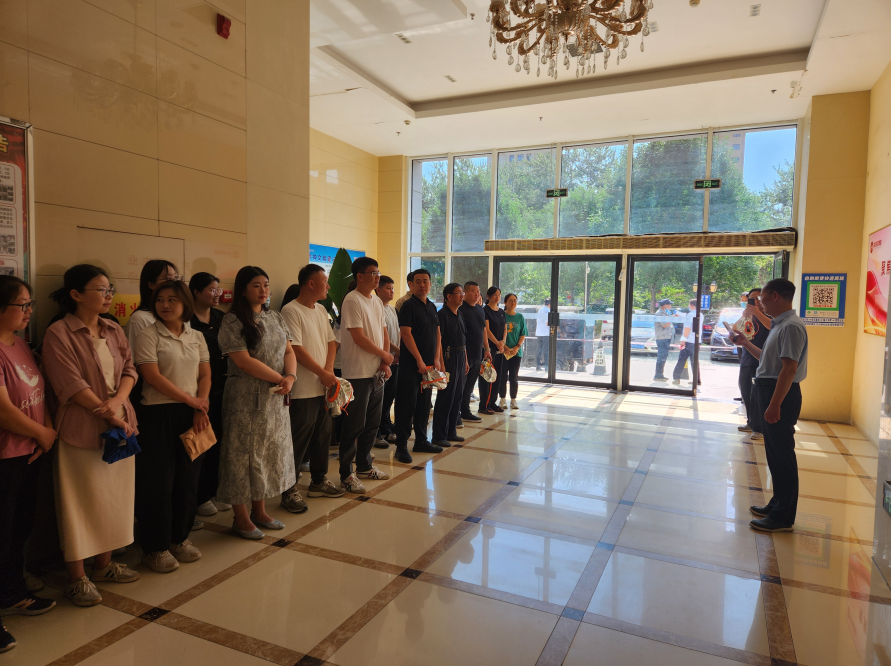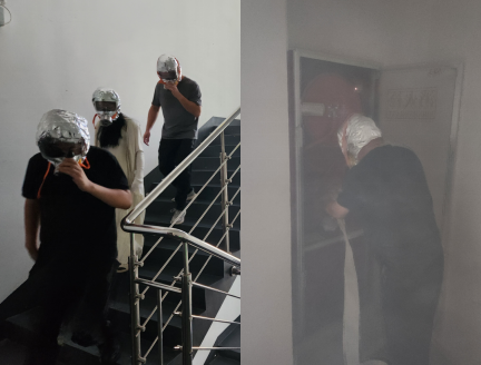 在演練活動現(xiàn)場,模擬8樓衛(wèi)生間處突發(fā)火災(zāi),集團(tuán)各樓層各部室隨即啟動應(yīng)急預(yù)案,撲救組按動火災(zāi)警鈴并進(jìn)行撲救,疏散組進(jìn)行引導(dǎo)疏散。員工在疏散過程中,彎腰低頭,用消防自救呼吸器或濕毛巾捂住口鼻,快速有序地從安全通道疏散樓梯向底層進(jìn)行撤離,最終撤離至辦公大樓前的安全地帶并進(jìn)行人數(shù)清點。