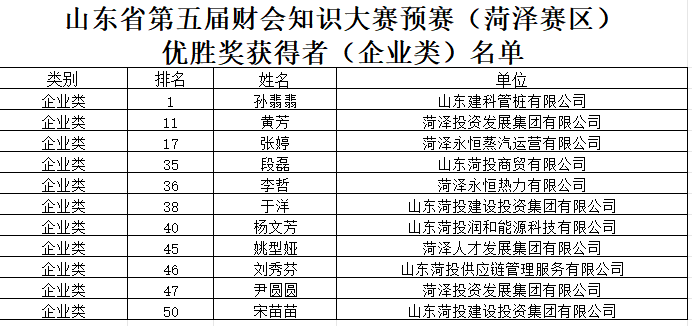 “山東省第五屆財(cái)會(huì)知識(shí)大賽 預(yù)賽(菏澤賽區(qū))”知識(shí)競賽近日公布優(yōu)勝獎(jiǎng)獲得者和入圍半決賽名單。菏澤投資集團(tuán)財(cái)務(wù)人員孫翡翡入圍半決賽,孫翡翡、黃芳、張婷等11名財(cái)務(wù)人員榮獲優(yōu)勝獎(jiǎng)。