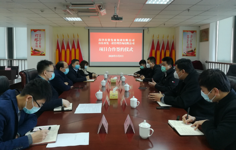 2020年3月5日上午,菏澤投資發(fā)展集團(tuán)有限公司與山東水發(fā)一諾管理咨詢有限公司項(xiàng)目合作簽約儀式在菏投集團(tuán)公司第二會(huì)議室舉行,菏投集團(tuán)公司黨委副書(shū)記、總經(jīng)理丁萬(wàn)國(guó)與水發(fā)一諾董事長(zhǎng)商亮代表合作雙方簽訂《項(xiàng)目合作協(xié)議》。菏投集團(tuán)黨委書(shū)記、董事長(zhǎng)徐文芹,黨委委員、副總經(jīng)理肖培飛,水發(fā)全程咨詢集團(tuán)有限公司副總經(jīng)理張世朝,水發(fā)一諾董事長(zhǎng)商亮,總經(jīng)理劉建勛等有關(guān)人員參加了座談與簽約儀式。