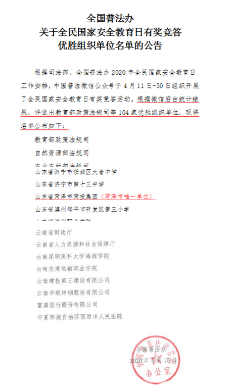 5月19日,全國(guó)普法辦公布了全民國(guó)家安全教育日有獎(jiǎng)競(jìng)答活動(dòng)優(yōu)勝組織單位名單,教育部政策法規(guī)司等104家單位被評(píng)為優(yōu)勝組織單位,菏投集團(tuán)名列其中,為菏澤市唯一優(yōu)勝組織單位。