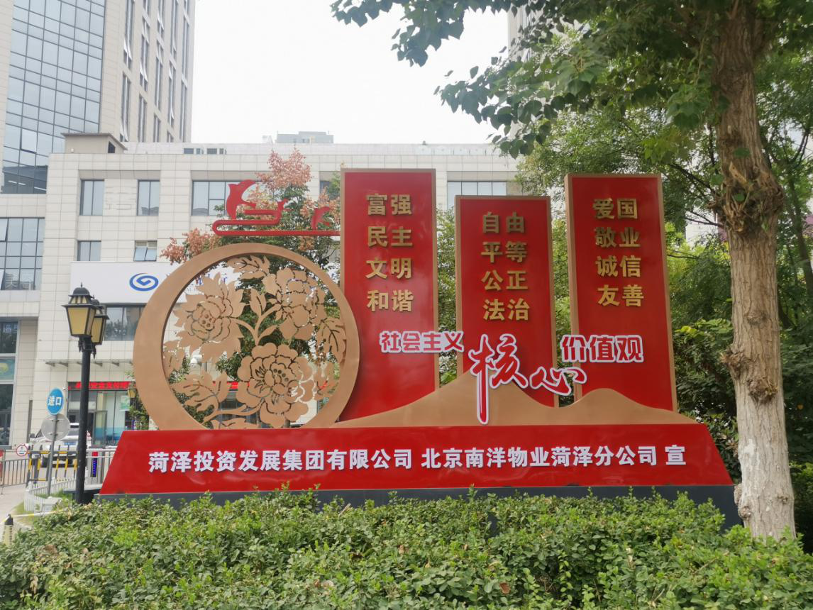 為積極響應(yīng)市委、市政府關(guān)于創(chuàng)建全國文明城市的號召,充分發(fā)揮黨建引領(lǐng)作用,大力弘揚中華民族優(yōu)秀傳統(tǒng)文化,培育和踐行社會主義核心價值觀,著力提升公民道德文化素養(yǎng)和城市文明水準,在公司黨委的正確指引和大力支持下,9月22日中秋和國慶雙節(jié)來臨之際,集團公司在經(jīng)典國際辦公區(qū)域入口處兩側(cè)分別設(shè)計安裝了大型黨建和社會主義核心價值觀主題標識牌。以高質(zhì)量造型雕塑為載體,充分展現(xiàn)了黨的意識形態(tài)陣地建設(shè)與周邊優(yōu)美的自然環(huán)境園林綠化的完美融合,把菏投集團打造成以黨建為引領(lǐng),匯聚人心、凝聚合力、堅守意識形態(tài)陣地建設(shè)的示范窗口。