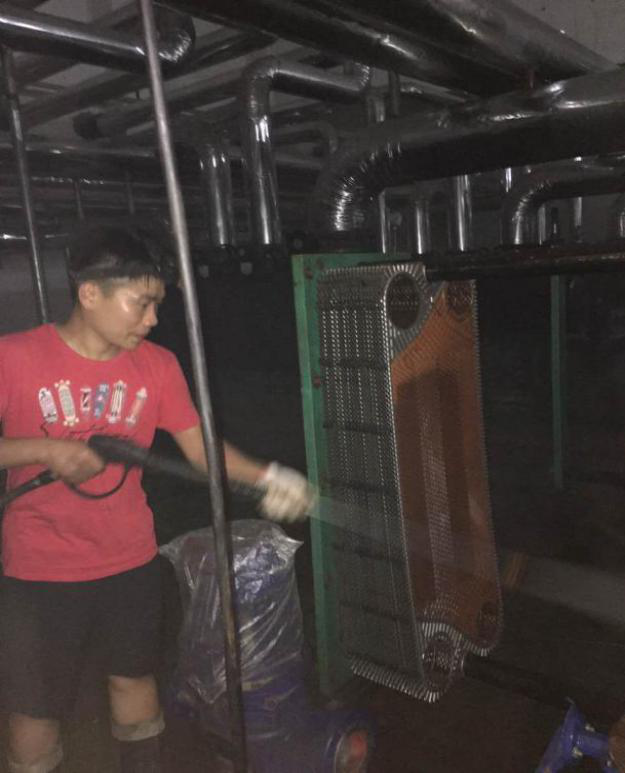 在6月份至7月上旬,隨著下個(gè)供暖的不斷臨近,換熱器作為整個(gè)供熱循環(huán)系統(tǒng)中必不可少的一個(gè)環(huán)節(jié),小區(qū)換熱器換熱能力的好壞直接決定了整個(gè)小區(qū)的取暖效果,也就決定了千家萬戶的取暖質(zhì)量。為有效改善轄區(qū)內(nèi)各小區(qū)換熱器小區(qū)的取暖效果,工作人員會(huì)在前期綜合研判的情況下對(duì)相關(guān)換熱器進(jìn)行清洗作業(yè)。雖然清洗換熱器是一個(gè)體力消耗巨大、又臟又苦的難活、累活,但是永恒熱力人對(duì)困難并沒有絲毫妥協(xié),面對(duì)清洗過程中,換熱片會(huì)逐漸干燥、脫水導(dǎo)致難以沖洗,為避免此問題,必須加班加點(diǎn)進(jìn)行清洗,直至清洗完畢。