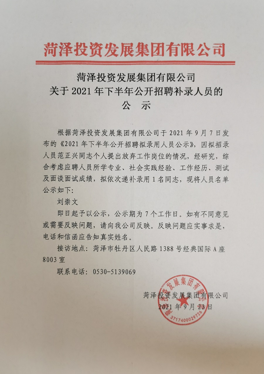 菏澤投資發(fā)展集團(tuán)有限公司關(guān)于2021年下半年公開(kāi)招聘補(bǔ)錄人員的公示