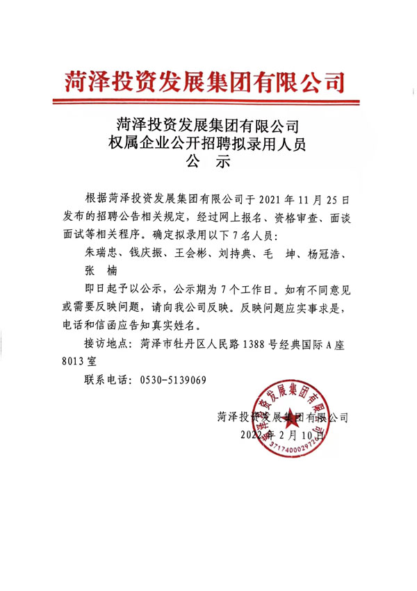 (六)研究公示。根據(jù)考察情況,提交菏投集團(tuán)黨委會(huì)議研究任職,并按照有關(guān)規(guī)定在菏澤市國(guó)資委網(wǎng)站(http://hzsgzw.heze.gov.cn/)或菏投集團(tuán)公司網(wǎng)站(http://www.fantexi0.cn/)進(jìn)行任前公示。公示反映有問(wèn)題,經(jīng)調(diào)查核實(shí)影響任職的,取消任職資格;未發(fā)現(xiàn)影響任用問(wèn)題的,按規(guī)定辦理手續(xù),下文任命。