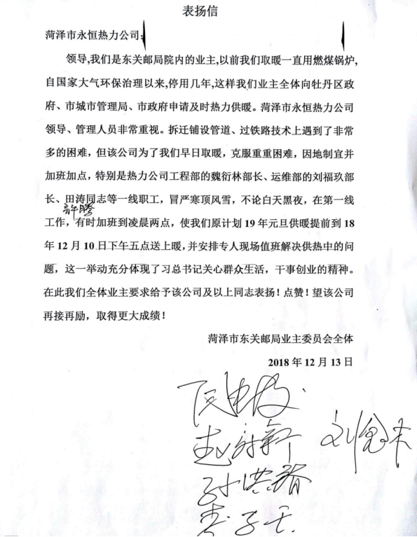 12月13日,永恒熱力辦公室收到了來自雙河路郵政局家屬院業(yè)主委員會(huì)的表?yè)P(yáng)信。感謝永恒熱力工程部和運(yùn)行管理五部盡心盡力為其解決供暖問題。