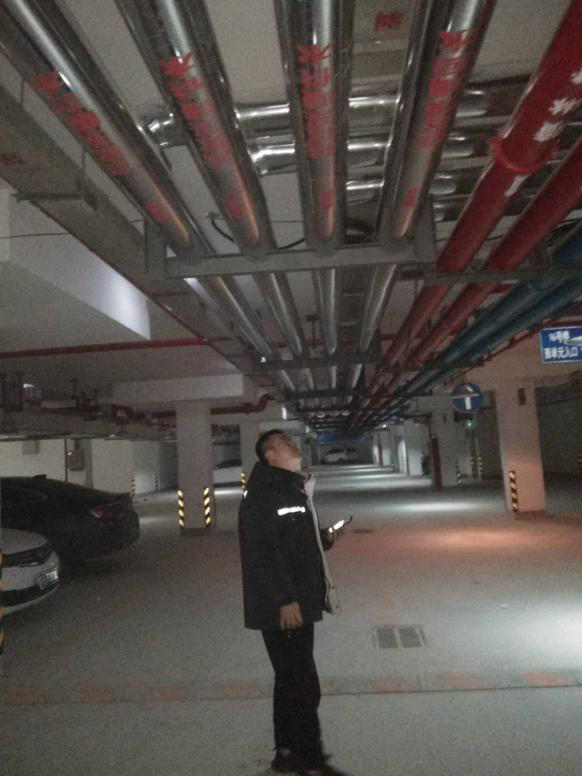 圖為管理人員巡查地下車庫架空暖氣管道