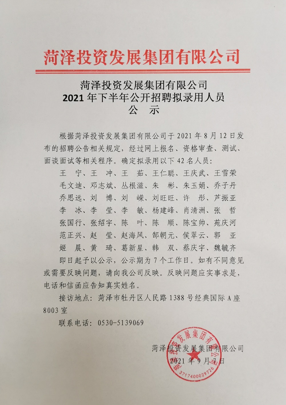 菏澤投資發(fā)展集團(tuán)有限公司2021年下半年公開招聘擬錄用人員公示