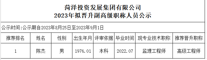 菏澤投資發(fā)展集團(tuán)有限公司2023年擬晉升副高級(jí)職稱人員公示