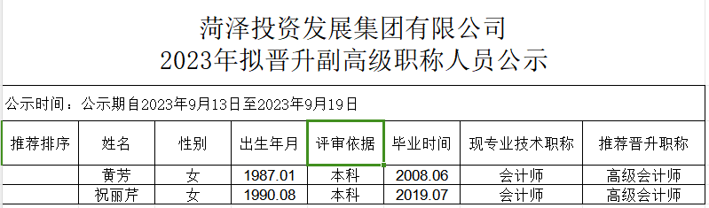 菏澤投資發(fā)展集團有限公司2023年擬晉升副高級職稱人員公示